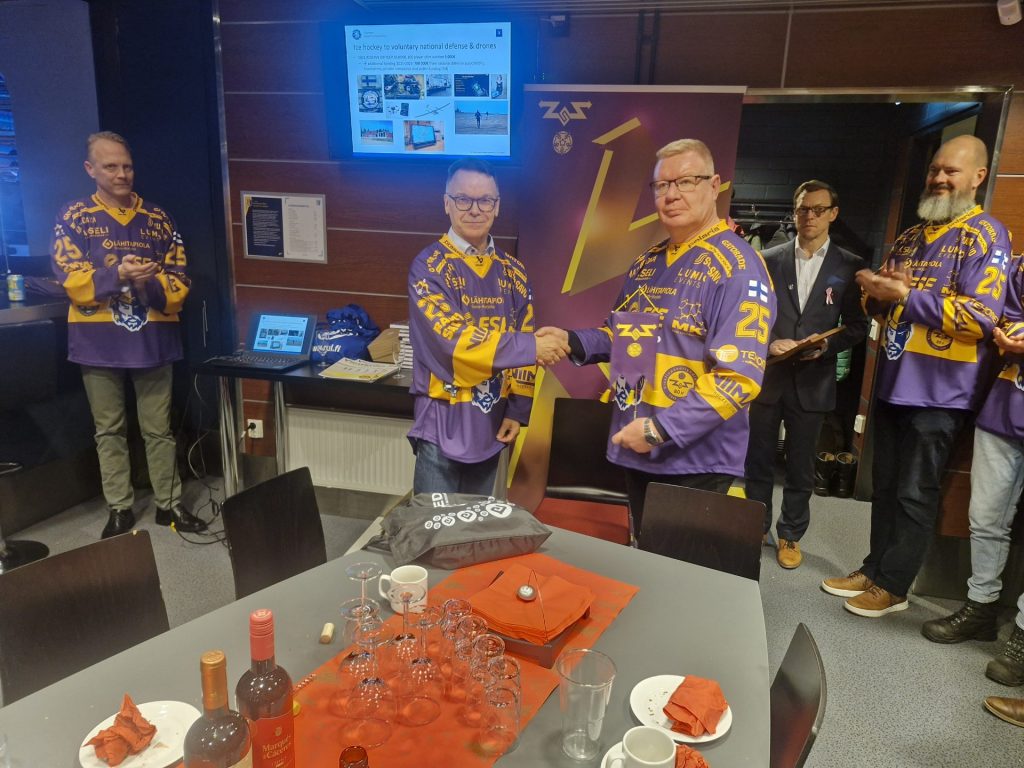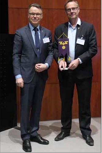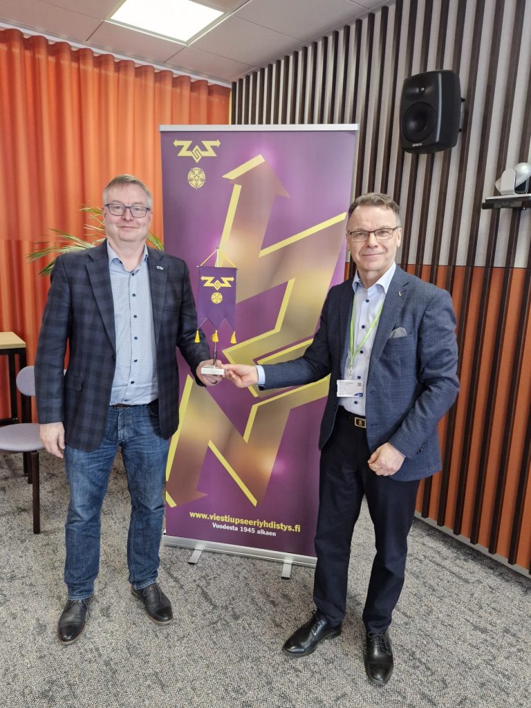 Puheenjohtaja Pertti Hyvärinen luovutti yhdistyksen standaarin ELISA:n turvallisuusjohtaja Jaakko Walleniukselle