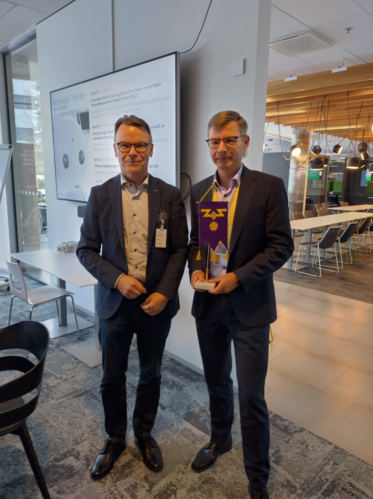 VUY:n puheenjohtaja Pertti Hyvärinen luovutti standaarin Nokian edustajalle Harri Holmalle